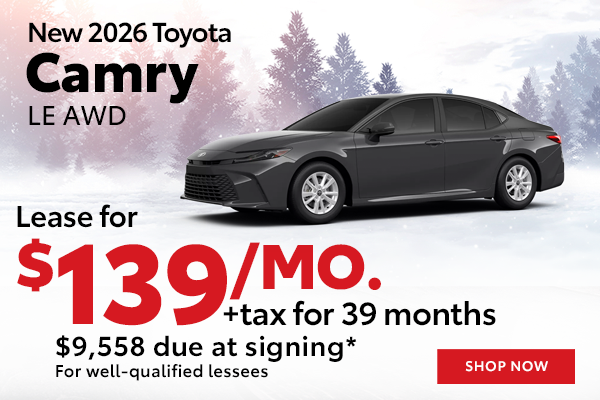 *Lease a New 2026 Toyota Camry LE for $139/mo (STOCK# TW551331, TSRP $34,114) Well-qualified lessees may lease for $139/mo for 39 months with $9,558 total due at signing (includes down payment, first monthly payment, bank acquisition fee, $420 doc & title prep fees, $0 security deposit). Sales tax, title, reg/license fees additional. Closed end lease. 10,000 miles/year. Lease end buy option $22,515. All incentives to dealer, cannot be combined with other offers. Take delivery by 3/2/2026.