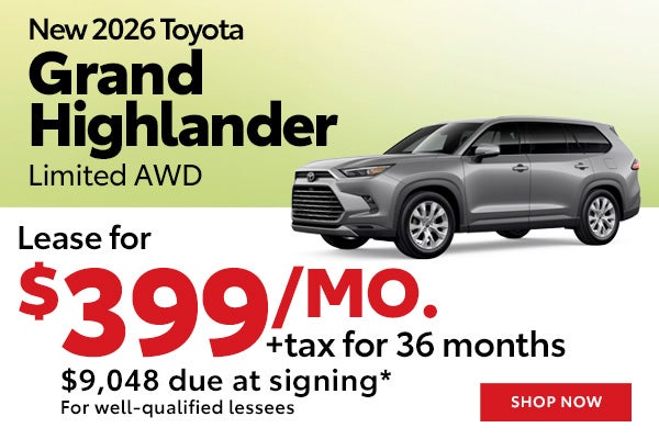 *Lease a New 2026 Toyota Grand Highlander Limited AWD for $399/mo (STOCK# TW552017, TSRP $57,528) Well-qualified lessees may lease for $399/mo for 36 months with $9,048 total due at signing (includes down payment, first monthly payment, bank acquisition fee, $420 doc & title prep fees, $0 security deposit). Sales tax, title, reg/license fees additional. Closed end lease. 10,000 miles/year. Lease end buy option $39,119. All incentives to dealer, cannot be combined with other offers. Take delivery by 5/4/2026.