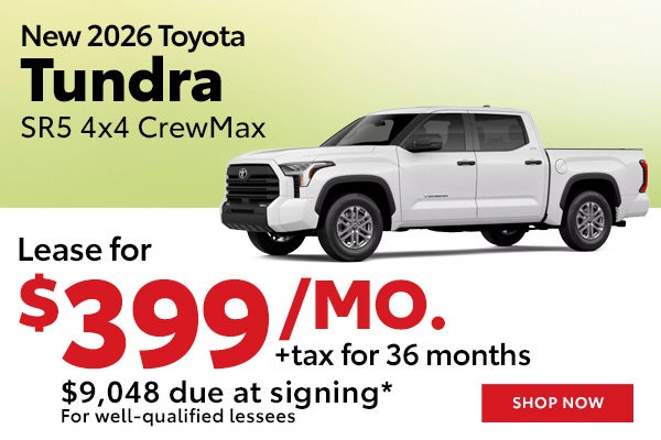 *Lease a New 2026 Toyota Tundra SR5 CrewMax 4WD for $399/mo (STOCK# TW551630, TSRP $57,228) Well-qualified lessees may lease for $399/mo for 36 months with $9,048 total due at signing (includes down payment, first monthly payment, bank acquisition fee, $420 doc & title prep fees, $0 security deposit). Sales tax, title, reg/license fees additional. Closed end lease. 10,000 miles/year. Lease end buy option $38,915. All incentives to dealer, cannot be combined with other offers. Take delivery by 3/31/2026.